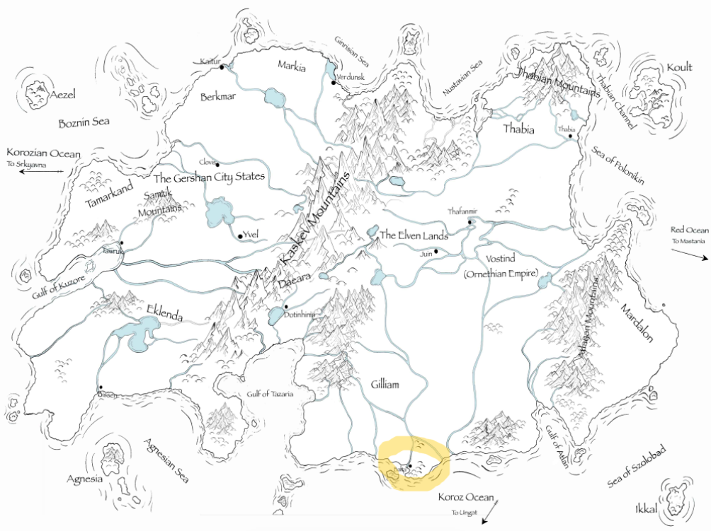 Really looking forward to working with Luke on this project. Thinking of extending the map a bit further to show the sprawl to the southeast. What I am glad for waiting a bit to start writing is that I have learned a lot about the world and worldbuilding since 2011-2015 when I did my initial thinking on this setting and 2021 when I started seriously writing. I say that to say that Balta is on the southern coast of the continent, circled in yellow.