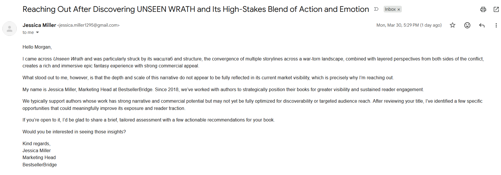 The Russian word translates to ‘scope,’ which is what a lot of the other scammers talk about, too. So, (shrug) just to give you folks a glimpse in. These come in 1-4 times a day in various forms, offering marketing, book visibility, search engine optimization (SEO), etc. General rule of thumb, legit businesses do not solicit your business over email. I get a fair bit of art scammers, too, but much less frequently (art scammers being people that try to either sell you someone else’s work or sell you AI-generated content, but claim that they drew it).