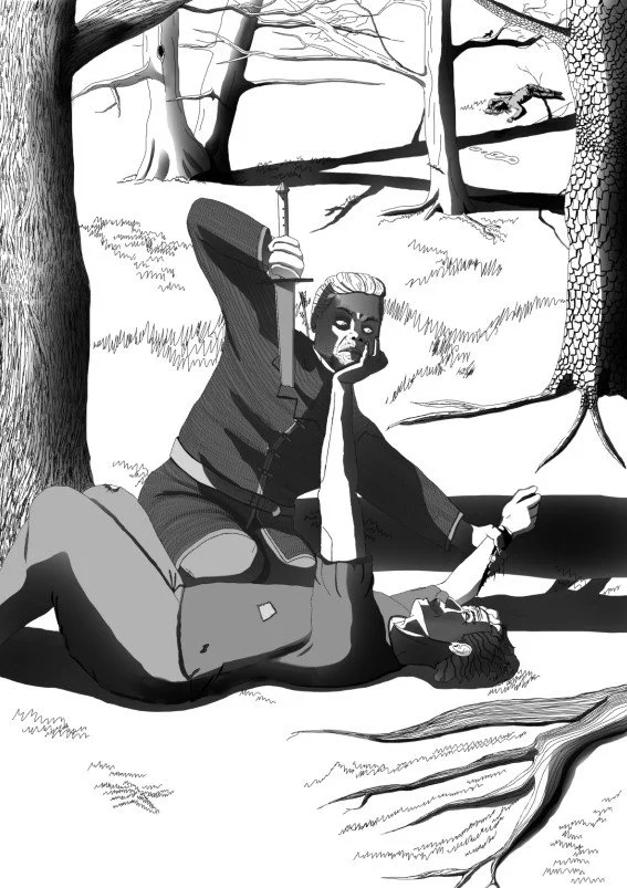 I know I said I’d try and get one illustration/work done per month, but I really, seriously underestimated the amount of work the shadows took. Here’s the scene from book 3, where Dareum struggles for his life.