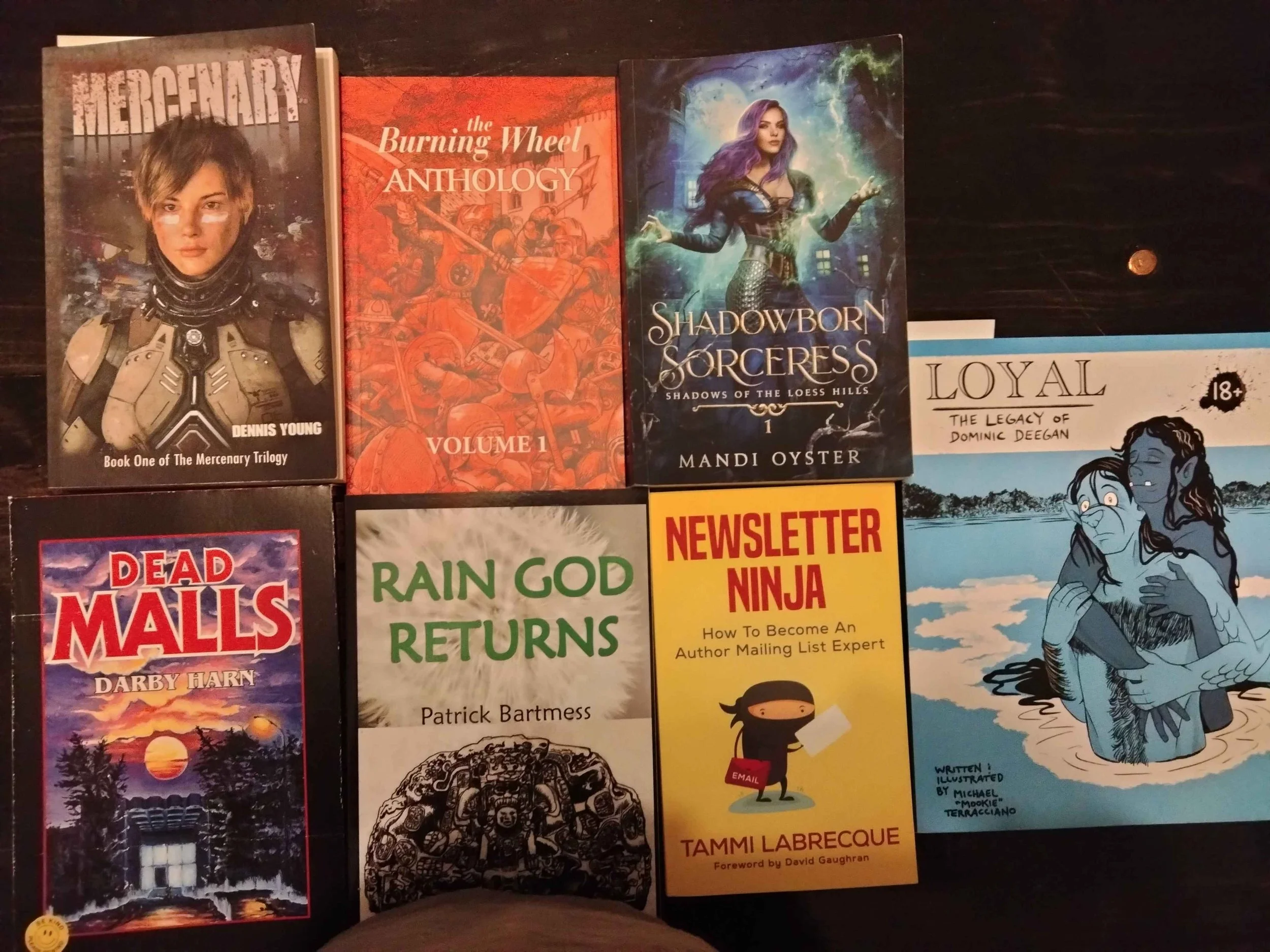 I mentioned that I picked up a few books at O-Con. This is actually modified, here. There are a couple that I got at O-Con that are not pictured, and a couple that I picked up outside O-Con, namely the Burning Wheel Anthology and Newsletter Ninja. I’m currently reading Mercenary by Dennis Young (whom I met at O-Con), Loyal by Michael Terracciano (also met at O-Con (and yes, that’s right, it’s 18+ because of a scene in there, but this is a thing to be aware of. You can sell your 18+ wares at some conventions, but they all have to be appropriately marked and can only be displayed in certain ways), and Newsletter Ninja by Tammi Labrecque.