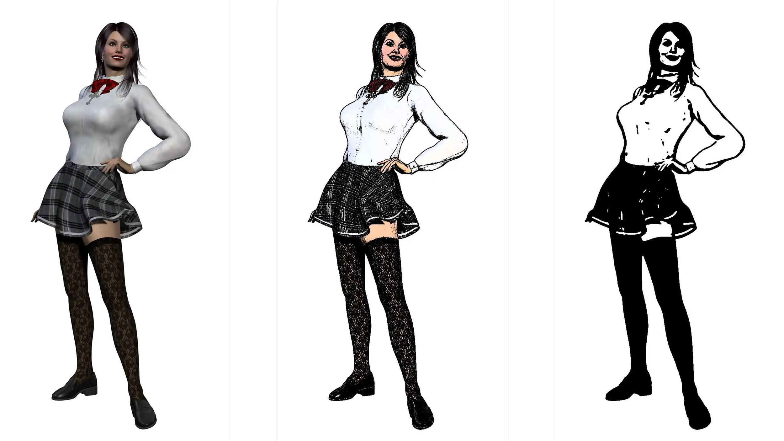 Right? Same woman. Drawn in 3d on the left and with different finishing techniques in the middle and on the right. So, what I’m envisioning with Steve’s help, is a scene with a lot of characters in it. So this is going to take care of two problems. First, each person, object, structure, character can be drawn as if it’s a focus, positioned in the environment, and then the snapshot can be taken from a point. In that snapshot, everything is rendered in perspective.